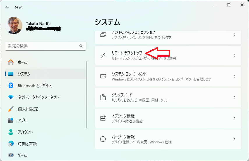 次にリモートディスクトップの設定です。これもYahoo検索で、「Windows11 リモートディスクトップ」で検索してください。分かり易そうなのが、「 https://solutions.vaio.com/4013 」に有りました。メニューの設定、リモートデスクトップ、ONです。