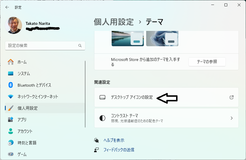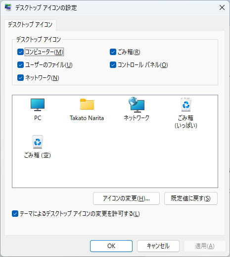 次は、IPアドレスの固定です。Yahoo検索では、いろいろ書いてるのですが、簡単すぎて実用的な結果にならないと思います。そこで、ちょっと細かく書きます。まず、便利なようにするために、これから使うアイコンを画面に出しましょう。画面を右クリックして、「個人用設定」、テーマ、デスクトップアイコンの設定、コンピュータから5つ有りますので、全てにチェックを入れてください。