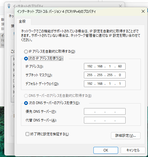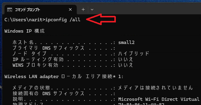 メニューに戻って、「すべてのアプリ」、Windows ツール、コマンドプロンプトを選んで起動します。カーソルの所に「>ipconfig /all」と入れてください。その中で、「192.168.1.6(優先)」などと書かれた項目を見つけてください。ローカルIPアドレスですね。この例では、192.168.1.xxx のxxxの所が、家庭内Lanで各パソコンに割り当てられている番号になります。「 https://qa.elecom.co.jp/faq_detail.html?id=8510 」が分かり易いと思います。そうそう、申し遅れましたが、これからやろうとしている事は、サーバですから、LAN への接続は、ケーブルを使った優先になります。