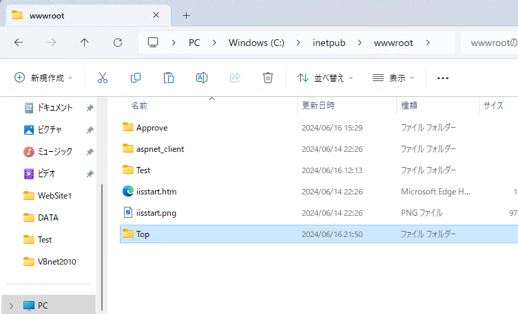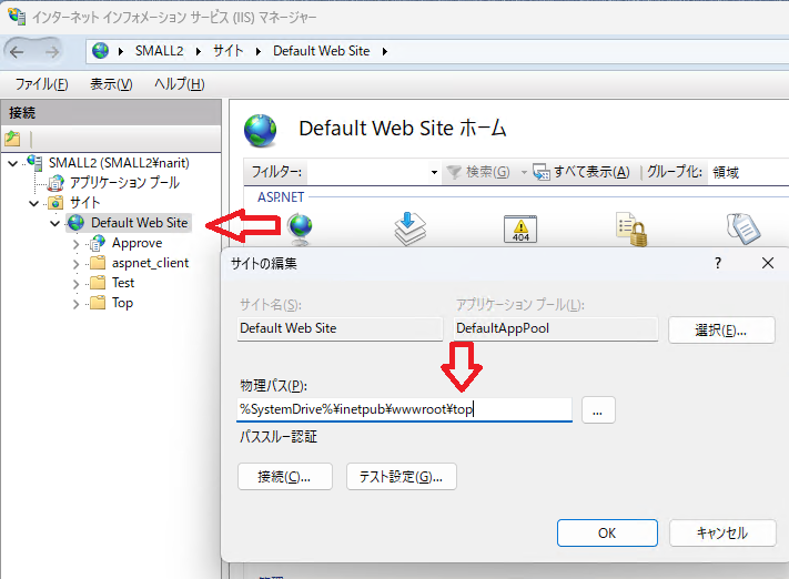 コピーしたらIISマネジャーを立ち上げ、左ペインを展開して、Default Web Site を選択します。その状態で、右ペインの「基本設定。。」をクリックします。物理パスにトップページの為に設けたホルダーを指定して、「OK」をクリックします。