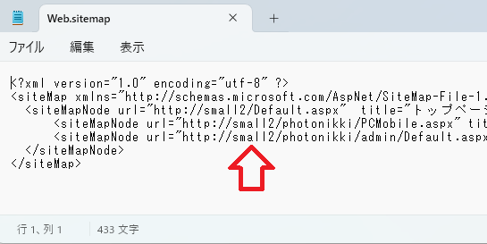 それでは、つぎは、フォト日記を追加してみましょう。例によって、このページの下にDownLoad を設けましたので、まずは、ファイルをダウンロードして解凍してください。解凍されたファイルの中に「Web.sitemap」と「Web2.sitemap」が有ります。それぞれをメモ帳などで開き、「small2」と書かれている所をご自分のサーバーの名前に置き換えてください。これらのファイルは、メニューのリンク先になります。