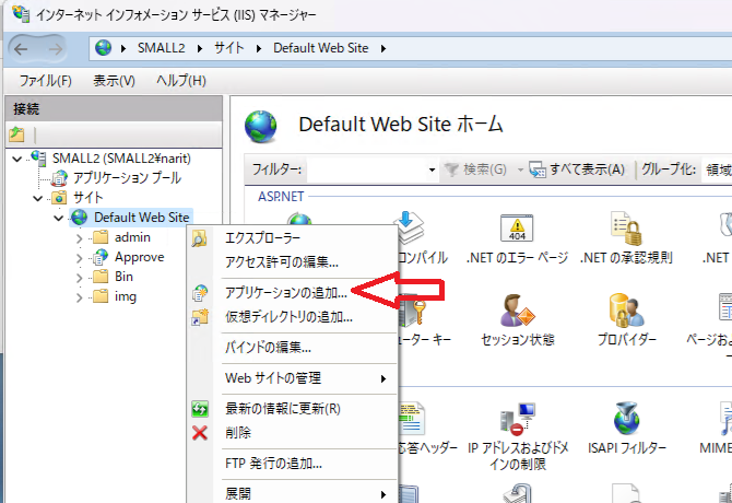IISマネージャーを立ち上げ、左ペインを展開して、「Default Web Site」を選択して、右クリックしてメニューを出します。その中から「アプリケーションの追加」を選びます。