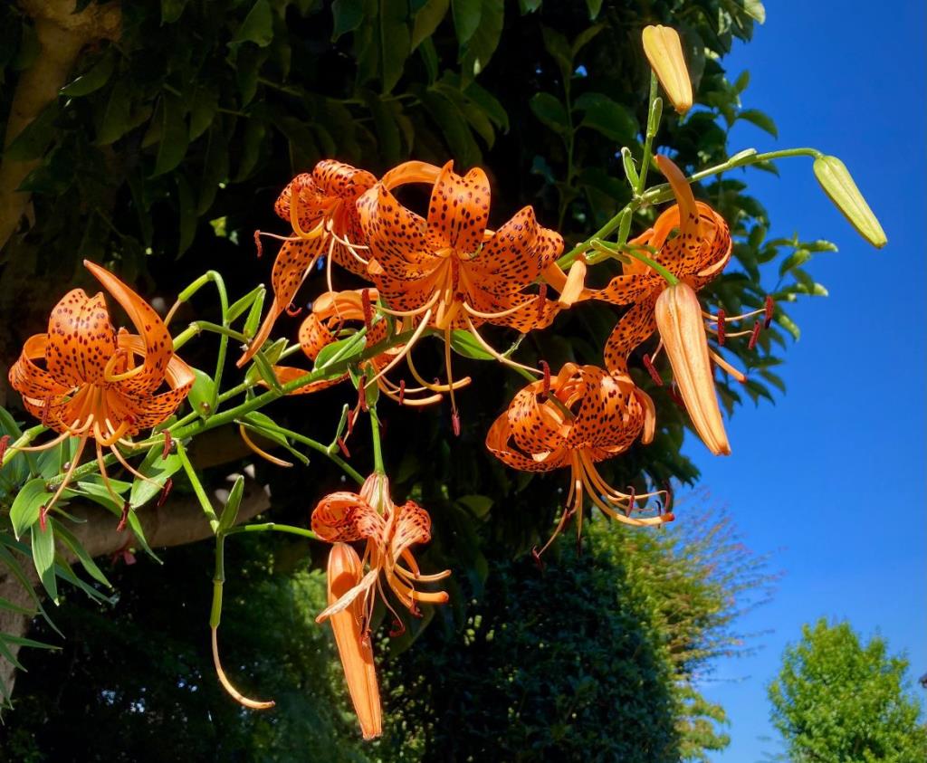 鬼百合が梅雨明けの青空を背景に、くっきり咲いています。