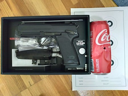 ただ、本物の銃に似せて作られていますので、外で撃つのは、ちょっと近所の目を気にしないとまずいと思います。ましてや、顔に自信の有るお父さんが、この銃を持っていれば、まさか、おもちゃだとは思われないでしょう。どこぞの名の有る組織の頭か組長と勘違いされ、通報でもされれば、面倒です。この銃の威力ですが、ジュースのアルミ缶を下に置いて撃つと、穴が開きます。車にあたれば、凹むなどの問題を起こすでしょう。おもちゃと言えど、弾の飛んだ先を考えないと、問題になると思います。空き缶を並べ、パンパンと缶を飛ばすところを見たら、もう確定です。どんな言い訳も通りません。事前に近所に十分に説明するか、やはり、室内に留めるか、厄介ですね。
