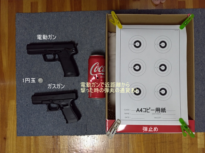 2つ目に買ったガスガンですが、重量は、電動ガンに比べやや軽量です。撃つと、ブローバックと言って、上部がスライドします。音も大きく、まるで本物はこうなんだと思わせる様な反動も有り、油の匂いまでします。威力は、法律で決められているので、電動ガンと同じです。使う弾も同じです。共通して使えます。重量は、0.2グラムと0.25グラムの2種類です。通常は、0.2グラムを使います。弾には、バイオBBと言う生分解プラスチックが有るので、外で使っても、環境に優しいと思います。ガスガンの反動のせいか、ぴたりターゲットに当てるのは、電動ガンより難しくなります。ですが、如何にも撃ったと言う感触が有り、好きか嫌いかと言えば、標的射撃で点数を競わなければ、こっちが良いですね。引き金を引くと、バッシと爆発音がして、上部スライドが動く、その為か反動が伝わり、標的に穴があく。そう言えば、この反動は、アメリカに居た時に撃った銃の反動に似ている。忘れていたけど、あのガンショップの錆びたような鉄製のガタ付いた銃より、銃らしい。外側は、プラスチックですが、見た目は、鉄に付けた黒メッキの高級感が有り、綺麗で気に入りました。お気に入りでは有りますが、音やスライドの動き、それに反動を考えると、これこそ外では、要注意ですね。きっと通報されます。