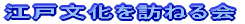| | 役 員 | | | | | | | | 会 長 : | 有友 嘉紀 | | 監 査 : | 山本 雅之 | | | 会 計 : | 中村 富忠 | | 事務局 : | 岩金 靖夫 | | | | | | | | | | 趣 旨 | | | | 江戸文化の名所旧跡を訪ね歩き、老舗に立ち寄り会合を持ち、会員相互の親睦を深める事を目的に活動しています 会員数 69名(2010年1月現在)